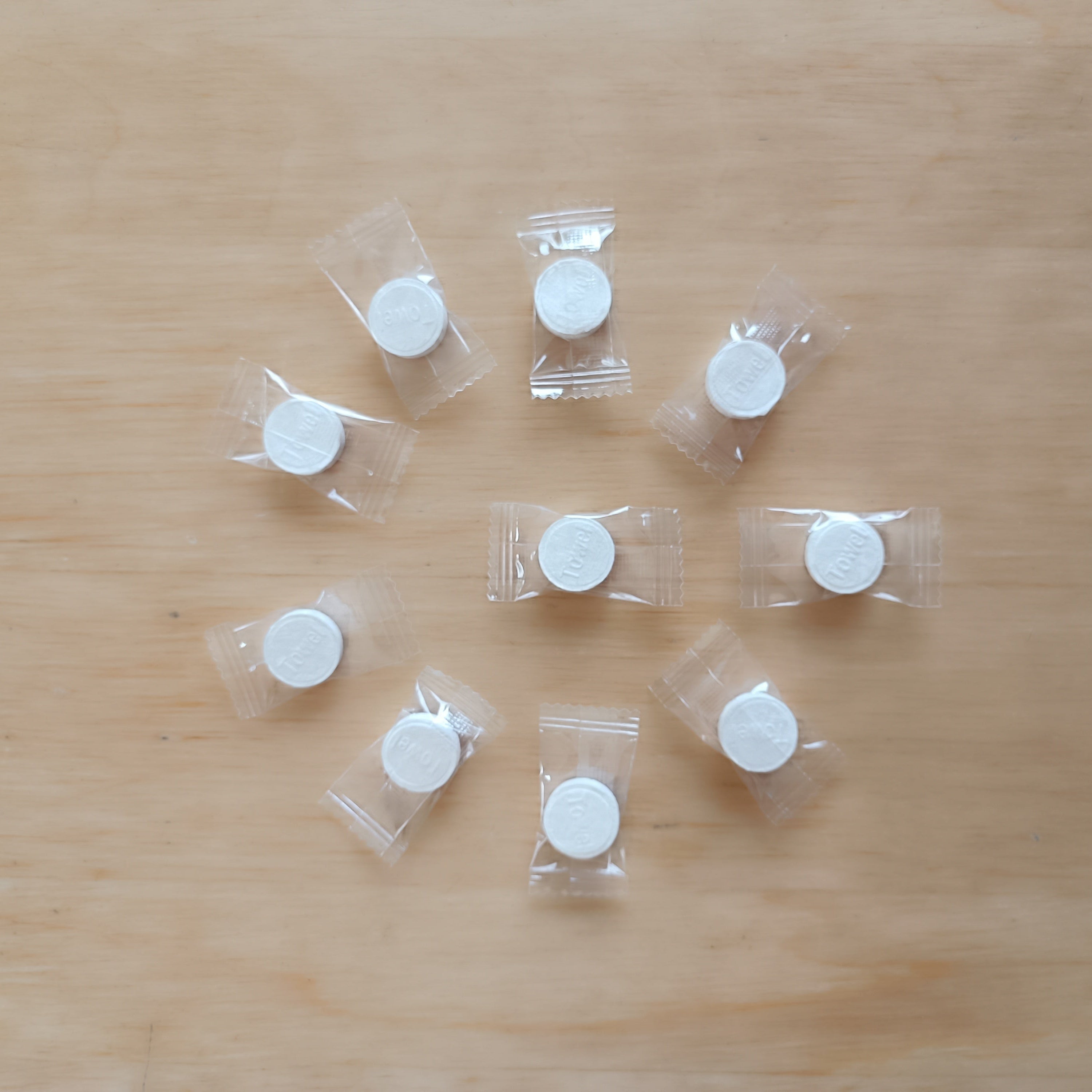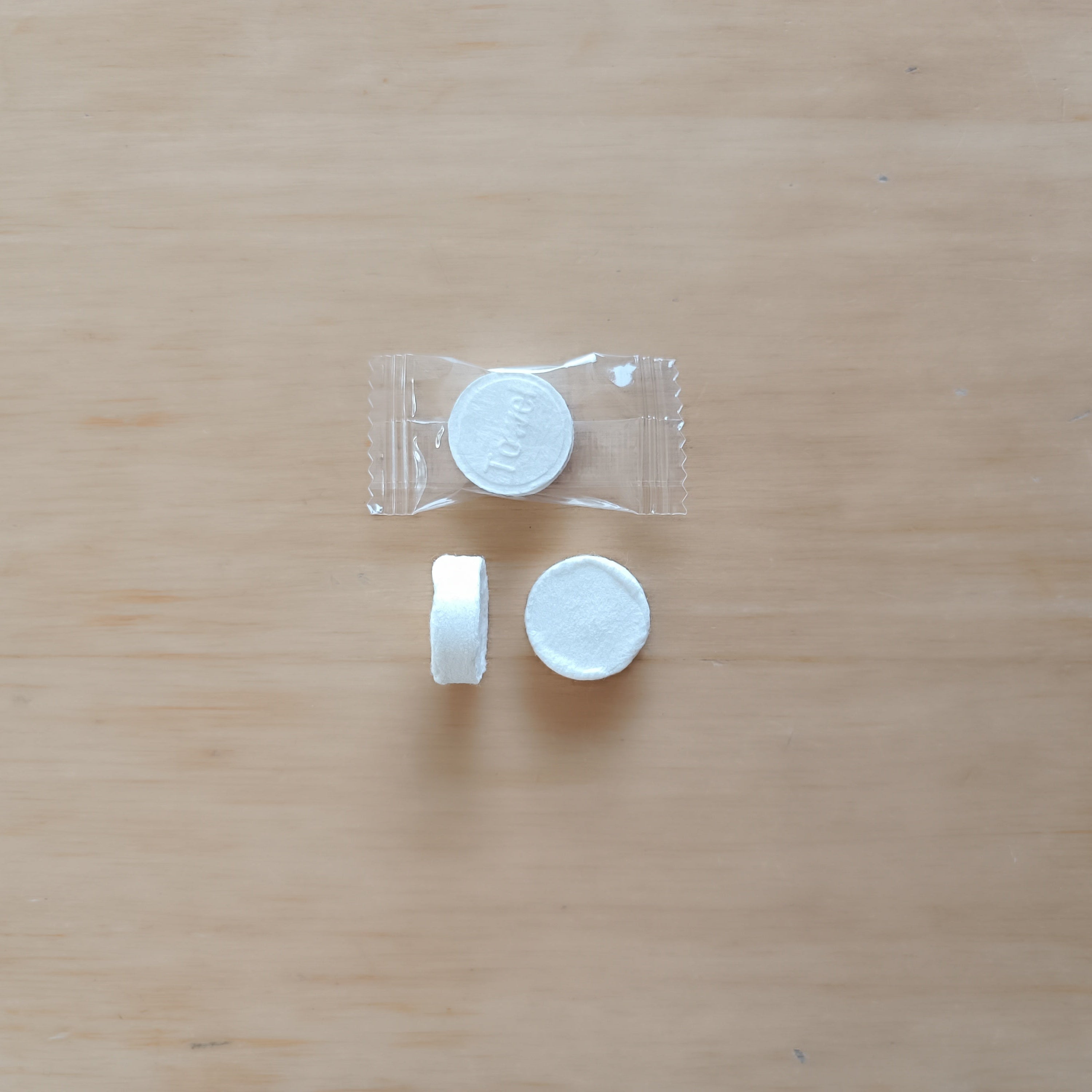 Vendues sous forme de galets dans leur emballage individuel, c'est au contact de l'eau qu'ils changent de forme.